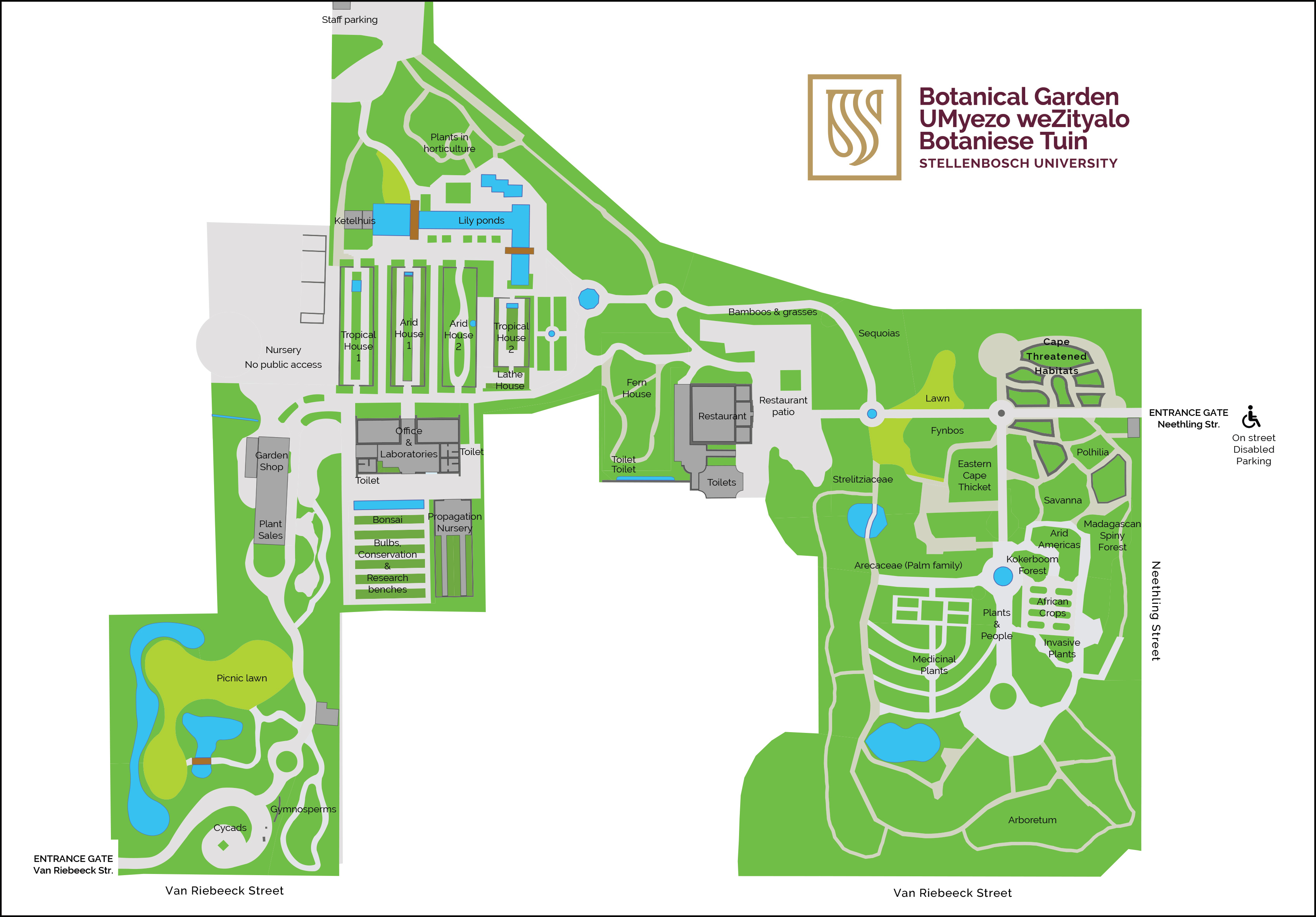 The Botanical Garden does not have a dedicated visitor parking area, a municipal parking area is located adjacent to the Garden in Van Riebeeck Street and street parking is also available surrounding the Garden.