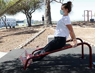 Die gimnasium-apparate, wat ongelyke optrekstawe, optrekstawe, 'n oefenfiets en 'n trapmasjien insluit, is op die Tygerberg-kampus se sportveld oorkant die nuwe Biomediese Navorsingsinstituut.