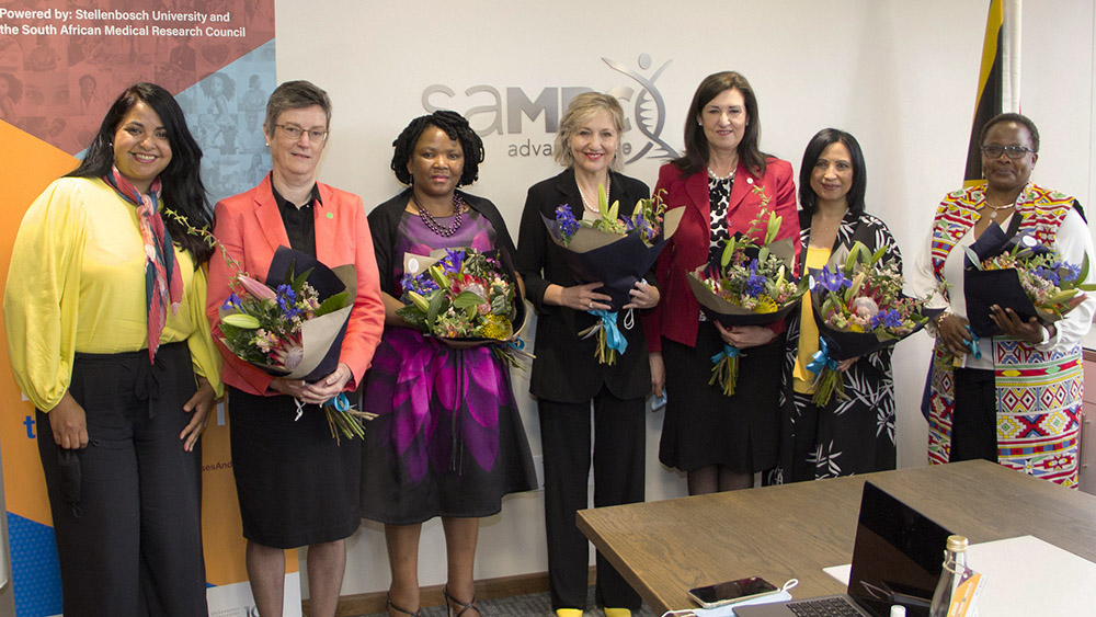 Insetsel-onderskrif: Prof Julia Blitz, minister Nomafrench Mbombo and proff Glenda Gray, Hester Klopper, Protia Jordan en Koreen Kaura.
