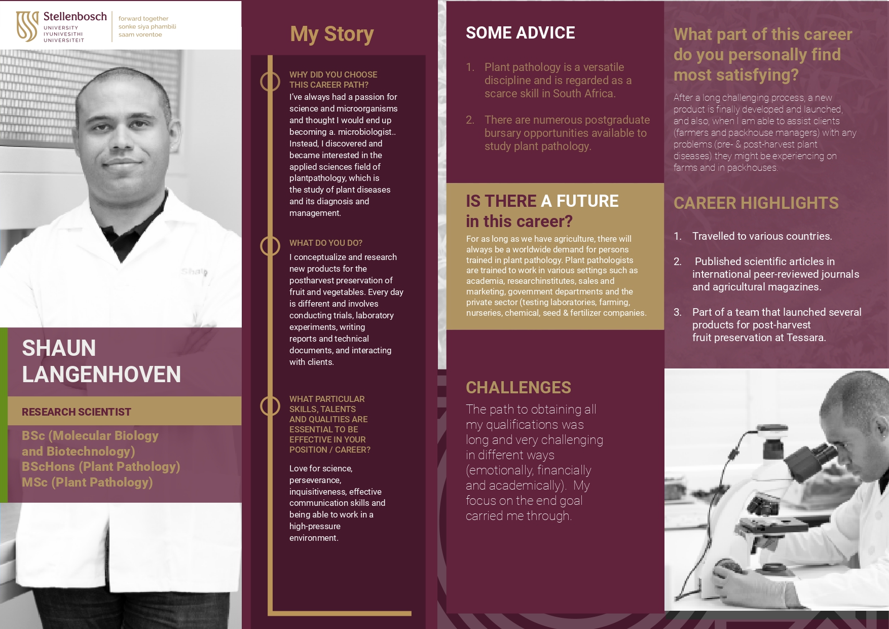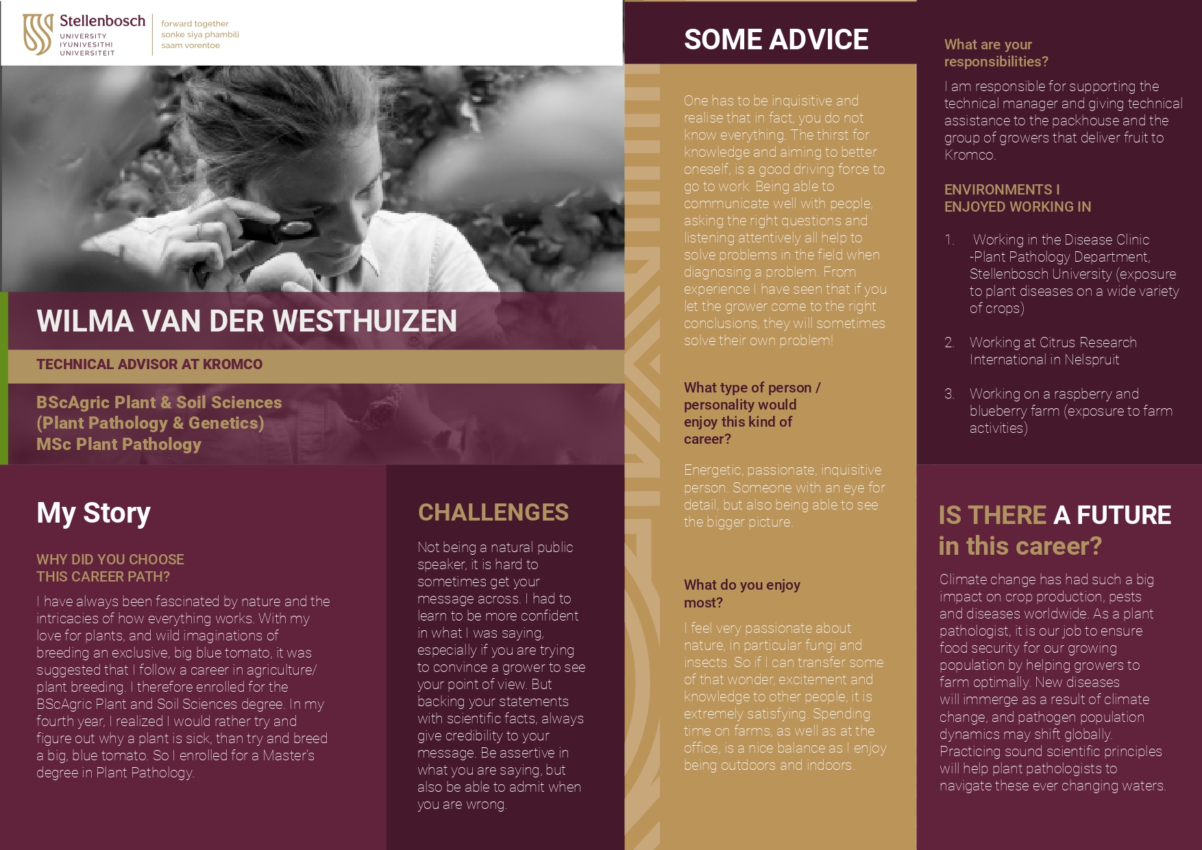 Jy kan ‘n loopbaan volg as navorser, akademikus, konsultant, tegnikus en planteteler, asook ‘n loopbaan by landbou-instansies, landbou chemiese maatskappye of diagnostiese klinieke.