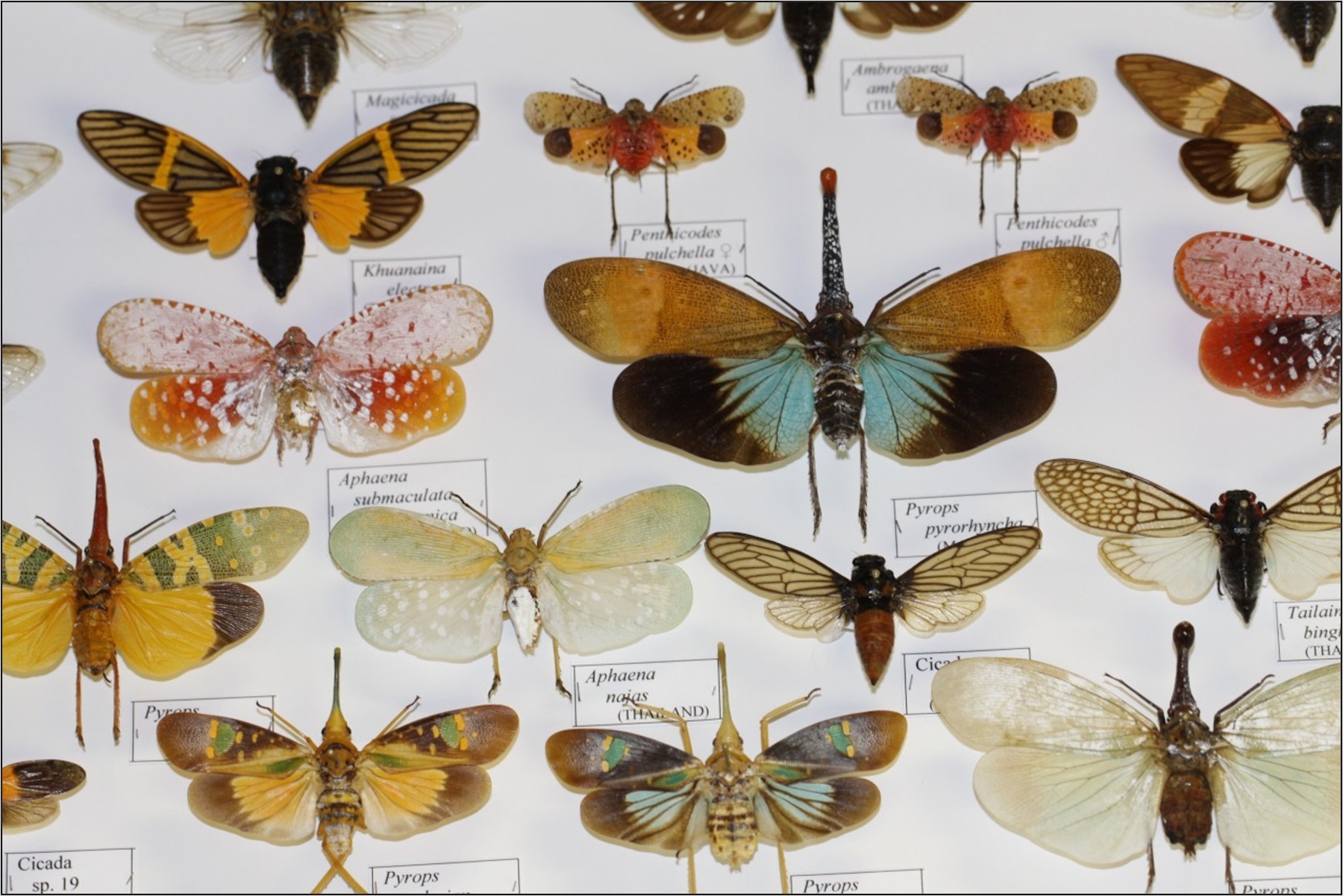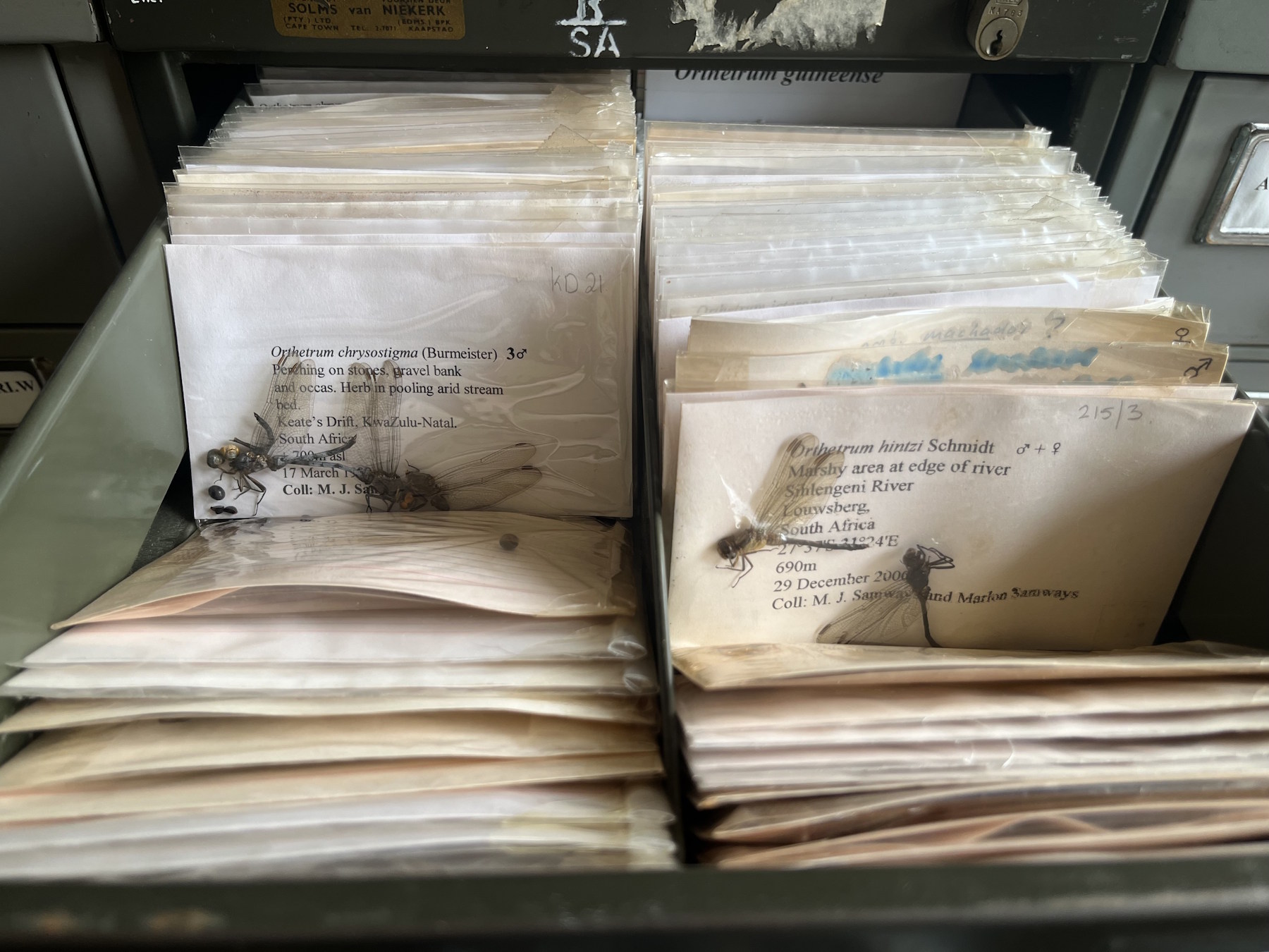 It is estimated that there are approximately 12 000 specimens in the collection, with an estimated 3000 being type specimens (leafhoppers, buprestids, Odonata and Orthoptera). The moths, leafhoppers and Odonata make up approximately 20% of the collection. The collection consists almost exclusively of South African species, with some leafhoppers and mosquitoes coming from outside of South Africa. A major taxonomic revision was completed in 2010 by Prof H.G. Geertsema on the Lepidoptera. Approximately 90% of the specimens are pinned, with 5% on slides (scales, mealybugs and aphids) while the other 5% are dragonflies in sleeves.
