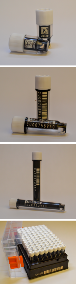All tubes have a unique, high-contrast, permanent, laser-etched chemical and heat resistant 2D barcode on the bottom of the tube, as well as a human readable number on the side of the tube. The 0.5ml and 1.0ml tubes are tri-coded, which means that in addition to the 2D barcode and human readable code, they also have a 1D linear barcode on the side of the tube. This tri-coded jacket feature offers a flexible solution to sample identification and scanning, allows for easy integration into your current workflow and supports sample sharing between labs and locations.