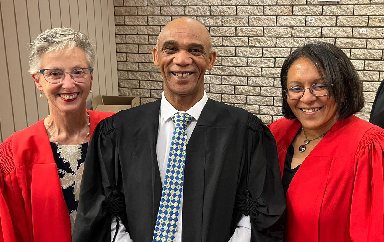 Banner-photo caption: Ms Farah Fredericks, Prof Karin Baatjes, Justice Edwin Cameron, Prof Elmi Muller, Mr Dan Ranna, Dr Therese Fish, Prof Nico Gey van Pittius and Prof Wim de Villiers.
