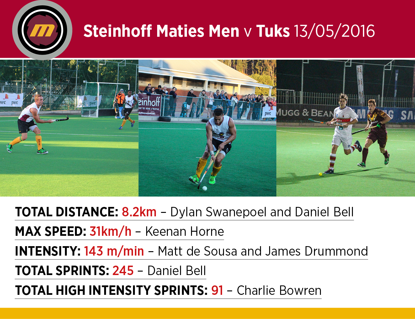 The Steinhoff Maties Hockey men's team at the recent Varsity Hockey tournament used the GPS units for the matches played in Stellenbosch. According to Van Velden these stats, along with the previous year's stats, will come in handy when preparing for the USSA tournament in July.
