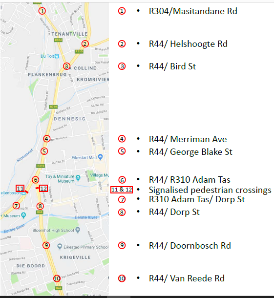 Above: The section of the R44 to be covered in the pilot, indicating the position of the intersections that will be included, plus possibly another two intersections and two signalised pedestrian crossings. MAP: SUPPLIED