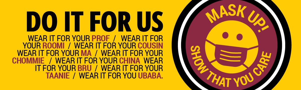 In response, the university has launched a campus-wide campaign to remind students why they should be wearing their masks. Various posters, banners, stickers and other communication have been put up on campus, reading everything from “Wearing is caring. Mask up!" to “Do it for your Gogo. Do it for your Auntie. Do it for your Oupa. Do it for your Ma. Do it for your Chommie. Do it for your Mommy. Do it for your Bru. Mask up!".