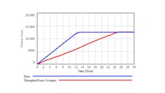 These dynamics change the aggregate impact from the well-organised technical solutions proposed above. They can be represented as random shocks, referred to here as “disruption noise”. This could dramatically increase the time needed to service each person, implying that fewer people are serviced per hour. This is illustrated in figure 2.