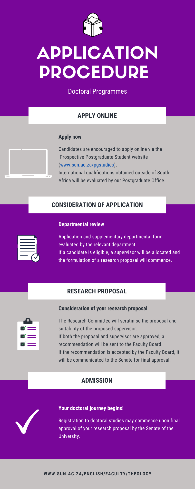 The Faculty consists of three discipline groups: Old and New Testament; Systematic Theology and Ecclesiology; and Practical Theology and Missiology. Postgraduate programmes are offered by the three discipline groups.